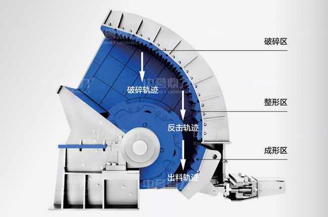 錘破制砂機內部從上到下分別是物料的破碎區(qū)、整型區(qū)、成型區(qū),其中破碎區(qū)的襯板花紋設計為波浪下行式,對物料起到整形作用,中間的整型區(qū)反擊板采用了菱形花紋設計,物料的運動軌跡在錘頭下方,有利于減少物料在機腔內重復破碎;