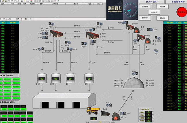 通過中控系統(tǒng)可以實現(xiàn)礦山設(shè)備的一鍵開關(guān)及單獨控制,通過傳感器等自動采集設(shè)備運行狀體及工作情況,如軸承溫度、設(shè)備工作電流、電壓、速度等狀態(tài)監(jiān)測,對電量、產(chǎn)量統(tǒng)計。實現(xiàn)各級設(shè)備及各環(huán)節(jié)的集中控制及管控。