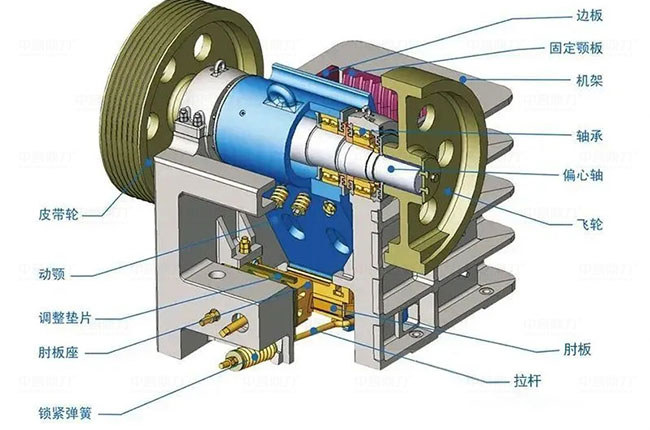 楔塊調(diào)節(jié)方法:增大出料粒度時(shí),通過(guò)轉(zhuǎn)動(dòng)螺帽,使楔塊沿著機(jī)架的后壁下降,促使前楔塊向后移動(dòng),實(shí)現(xiàn)推動(dòng)肘板與動(dòng)鄂也向后移動(dòng),進(jìn)而擴(kuò)大開(kāi)料口,縮小排料口反向操作即可。楔塊調(diào)節(jié)分機(jī)械和液壓兩種方式,液壓方式更省力,無(wú)調(diào)節(jié),過(guò)鐵保護(hù)及清腔操作。