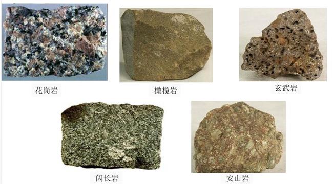 常見巖漿巖有:花崗巖、花崗斑石、流紋巖、正長石、閃長石、安山石、輝長巖和玄武巖等(強(qiáng)度約為250兆帕)。