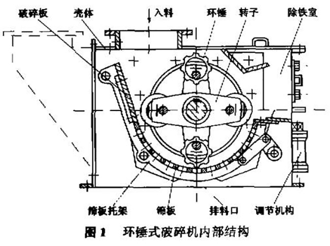 從以上KRC800環(huán)錘式破碎機結(jié)構(gòu)圖我們看到,設(shè)備的主軸上安裝有數(shù)排掛錘體,在其圓周的銷孔上貫穿著銷軸,用銷軸將錘頭鉸接在各排掛錘體之間,錘頭磨損后可調(diào)換工作面。掛錘體上開有兩個銷孔。銷孔至回轉(zhuǎn)軸心的距離是不同的,可以用來調(diào)整錘頭和篦條之間的間隙。轉(zhuǎn)子兩段支撐在滾動軸承上,軸承有螺栓固定在機殼上。主軸和電動機用彈性聯(lián)軸器連接。