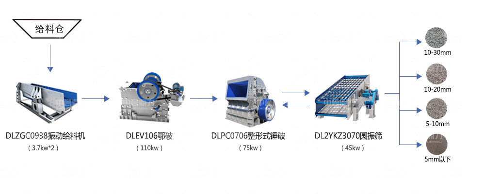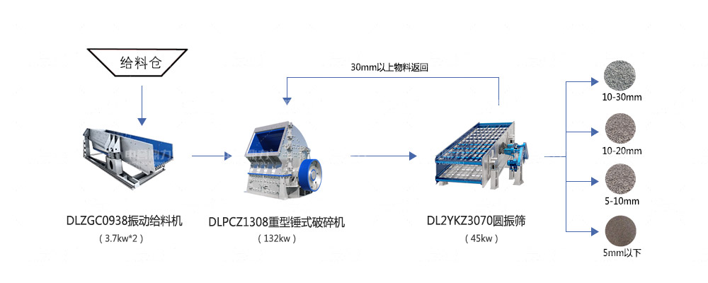 中低硬度物料主機(jī)可以選擇錘式破碎機(jī),一次成型,集破碎和整形于一體,初級(jí)破碎出一部分成品料,大于30mm以上的物料被返料返送至錘式破碎機(jī)中再次破碎,振動(dòng)篩篩網(wǎng)層級(jí)和篩孔尺寸可以根據(jù)客戶對(duì)成品料需求進(jìn)行增減和定制。