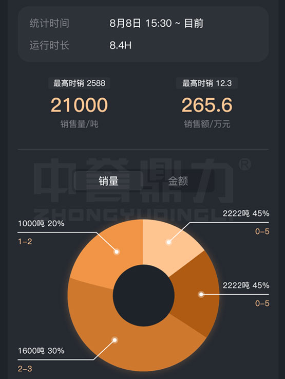 交接班(廠內(nèi)的上下班時間)、開關(guān)機(jī)(班次的開始結(jié)束時間)、自然日(0~24點(diǎn)) 銷量、銷售額(數(shù)據(jù)來自銷售系統(tǒng)) 各料類銷售占比餅圖,噸數(shù)、銷售額占比等各類銷售數(shù)據(jù)盤融入礦山管家APP,助力實現(xiàn)智慧礦山。