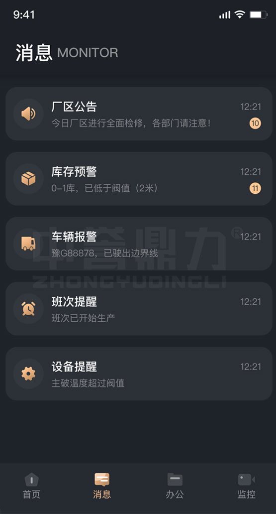 包含廠區(qū)公告、庫存預(yù)警、車輛報警、班次提醒、設(shè)備提醒的消息通知,支持離線通知