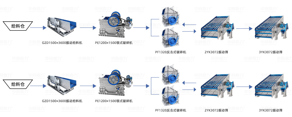 設(shè)備搭配方案:GZD1500×3600給料機*2、PE1200×1500顎破機*2、PF1320反擊破*4臺、2YK3072振動篩*2、3YK3072振動篩*2、皮帶機。