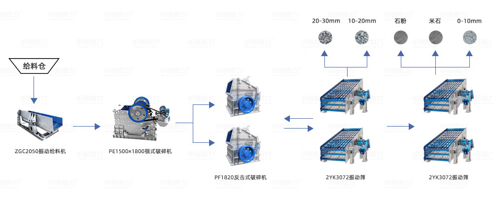 原料倉(cāng)+ZGC2050振動(dòng)給料機(jī)+PE1500×1800顎式破碎機(jī)+PF1820反擊式破碎機(jī)*2臺(tái)+2YK3072振動(dòng)篩*4臺(tái)。