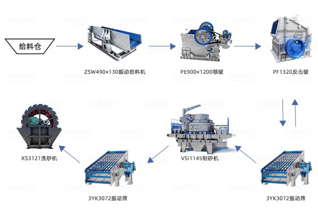 配置設(shè)備:ZSW490×130振動給料機、PE900×1200顎破、PF1320反擊破、VSI1145制砂機、3YK3072振動篩*2臺、XS3121洗砂機。