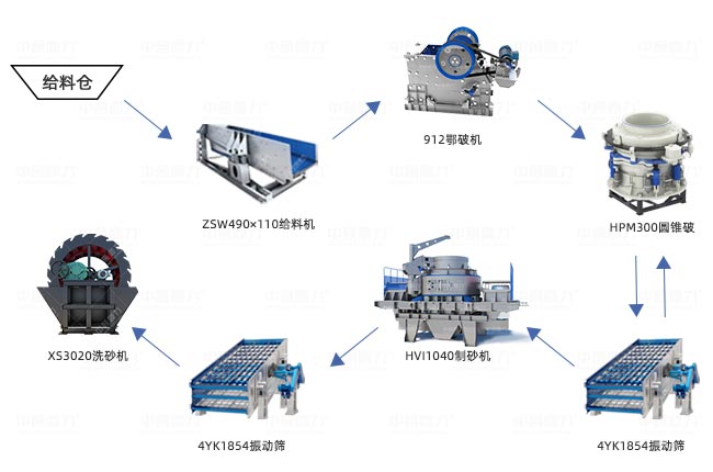 設(shè)備搭配:ZSW-490×110振動給料機、912鄂破機、HPM300圓錐破、HVI1040制砂機、4YK1854振動篩*3臺、3020洗砂機*3臺
