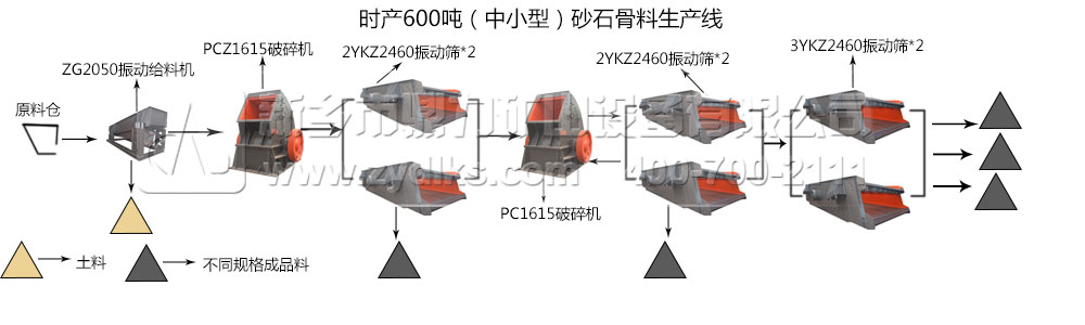 從工藝流程圖可以看到,時(shí)產(chǎn)600噸的中小型砂石骨料生產(chǎn)線不像大型、大型的生產(chǎn)線那種復(fù)雜曲折,這個(gè)工藝流程圖比較通俗易懂,一目了然。原料倉的物料進(jìn)過振動給料機(jī)進(jìn)入破碎機(jī)破碎腔內(nèi)進(jìn)行破碎的工作,破碎的物料經(jīng)過兩臺振動篩的同時(shí)篩分,一部分物料經(jīng)過篩分得到顆粒粒度合適的成品料,另一部分物料直接進(jìn)入二級破碎機(jī)破碎腔內(nèi)部進(jìn)行再次破碎,然后再經(jīng)過不同直徑規(guī)格的振動篩進(jìn)行篩分,再次獲得不同顆粒粒度的成品料。