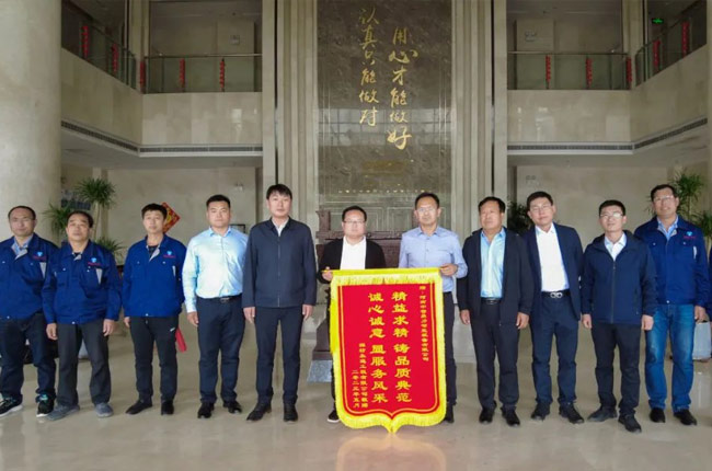 考察團(tuán)來(lái)到中譽(yù)鼎力廠區(qū)后,首先送上了感謝錦旗,盛贊中譽(yù)鼎力“精益求精,鑄品質(zhì);誠(chéng)心誠(chéng)意,顯服務(wù)風(fēng)采”。