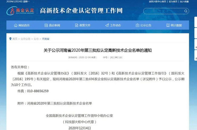 根據(jù)家《高新技術企業(yè)認定管理辦法》(科發(fā)火〔2016〕32號)和《高新技術企業(yè)認定管理工作指引》(科發(fā)火〔2016〕195號)有關規(guī)定,12月4日,高新技術企業(yè)認定管理工作導小組辦公室在官網(wǎng)上對河南省2020年第三批擬認定高新技術企業(yè)名單進行了公示。