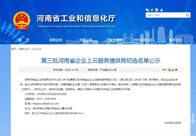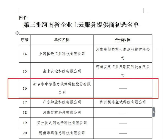 為貫徹落實(shí)《河南省智能制造和工業(yè)互聯(lián)網(wǎng)發(fā)展三年行動(dòng)計(jì)劃(2018—2020年)》(豫政〔2018〕14號(hào)),完善企業(yè)云服務(wù)生態(tài)體系,加快省企業(yè)上云上平臺(tái)步伐,按照《河南省企業(yè)上云三年行動(dòng)計(jì)劃(2018-2020年)》(豫工信產(chǎn)融〔2018〕92號(hào))和2020年河南工信廳有關(guān)工作安排,今年10月,省工信廳公開(kāi)征集第三批河南省企業(yè)上云服務(wù)提供商。經(jīng)自主申報(bào)、評(píng)審和網(wǎng)上公示,中譽(yù)鼎力軟件科技股份有限公司初步入選云服務(wù)商名單。