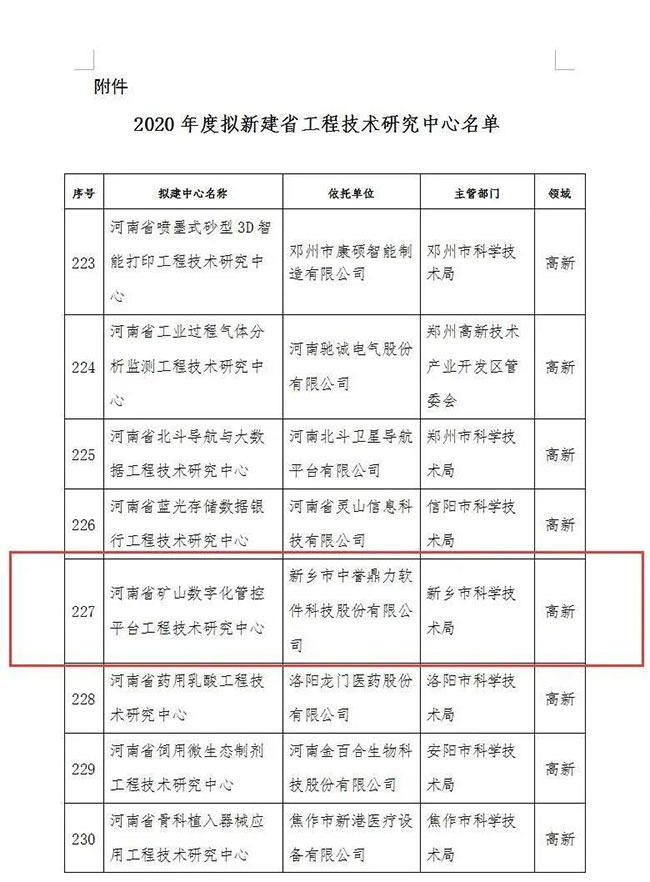 依托新鄉(xiāng)市中譽(yù)鼎力軟件科技股份有限公司建設(shè)的河南省礦山數(shù)字化管控平臺(tái)工程技術(shù)研究入選擬新建省工程技術(shù)研究名單,并順利通過(guò)公示。