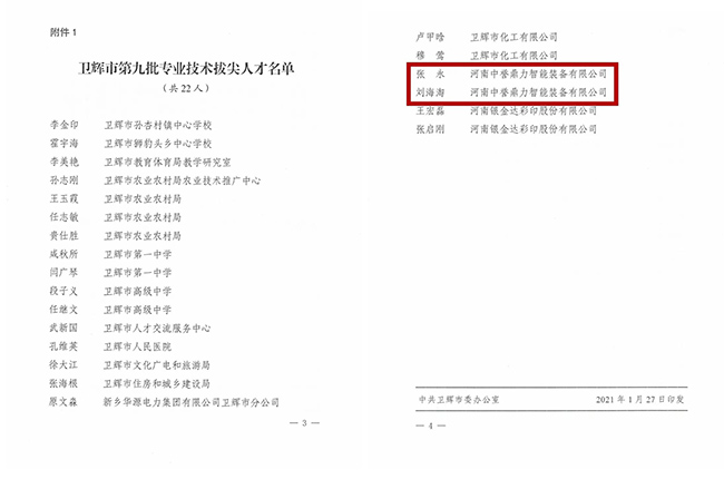 2021年1月27日,衛(wèi)輝市委、市發(fā)布《關(guān)于命名衛(wèi)輝市第九批技術(shù)拔尖人才的決定》。中譽(yù)鼎力董事長(zhǎng)張永、河南中譽(yù)鼎力智能裝備有限公司技術(shù)中心部長(zhǎng)劉海淘被任命為“衛(wèi)輝市技術(shù)拔尖人才”!