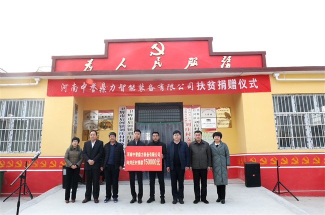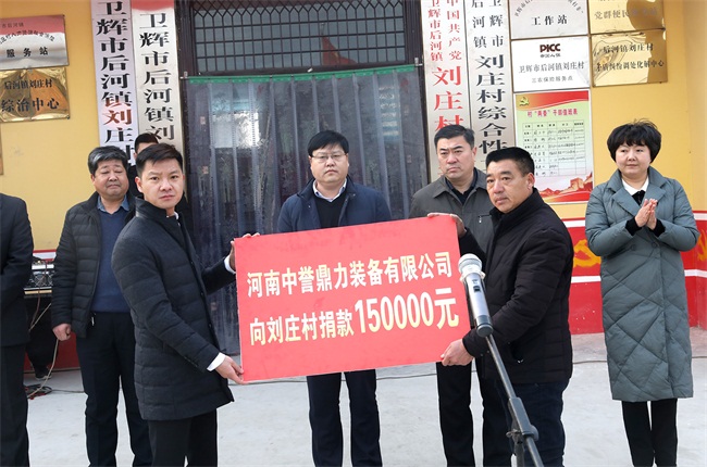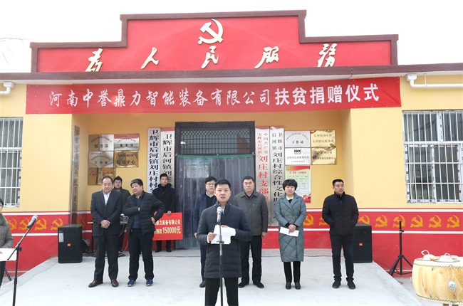 河南中譽(yù)鼎力智能裝備有限公司董事長(zhǎng)張治民發(fā)表講話:“中譽(yù)鼎力作為土生土長(zhǎng)的衛(wèi)輝企業(yè),離不開的關(guān)心和百姓的支持。公司牢記社會(huì)責(zé)任,積響應(yīng)扶貧工作,落實(shí)‘企業(yè)分包貧困村’政策,與后河鎮(zhèn)劉莊村結(jié)對(duì)幫扶。經(jīng)公司研究決定,河南中譽(yù)鼎力智能裝備有限公司此次向劉莊村捐款15萬元,主要用于劉莊村的基礎(chǔ)設(shè)施建設(shè)。”