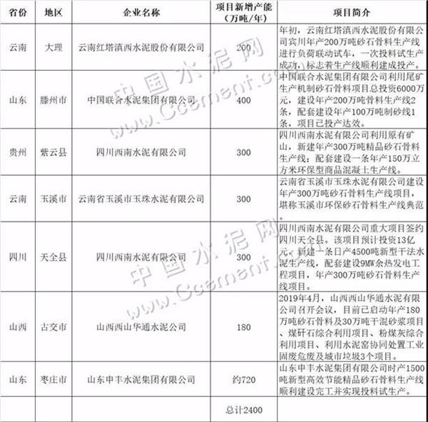以下表格列舉了部分水泥企業(yè)2019年投產(chǎn)的砂石骨料生產(chǎn)線(xiàn),年產(chǎn)骨料約2400萬(wàn)噸。