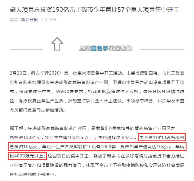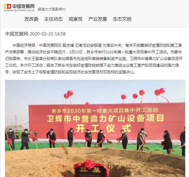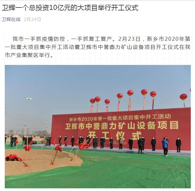報道鏈接:【資訊】投資10億,衛(wèi)輝市中譽鼎力礦山設備項目正式開工!