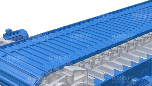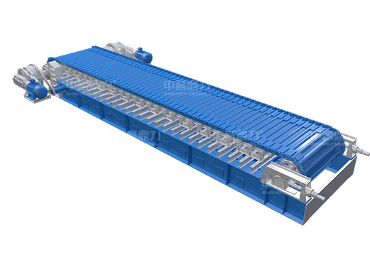電動(dòng)機(jī)轉(zhuǎn)動(dòng),通過傳動(dòng)軸和驅(qū)動(dòng)裝置,帶動(dòng)主軸旋轉(zhuǎn),鏈輪和鏈條安裝在主軸裝置上,通過該裝置帶動(dòng)鏈條上的鏈板做直線運(yùn)動(dòng),鏈條上安裝有承料槽板,鏈板的直線運(yùn)動(dòng)將物料均勻的帶到鏈條的槽板上,并向前輸送,達(dá)到輸送物料的目的。