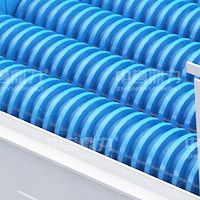 滾軸篩由箱體、軸承座、鏈條、鏈輪、滾軸、滾片、電機等結構組成。開機啟動后,鏈輪通過鏈條帶動滾軸翻轉,滾軸轉動方向與物料流動方向一致,泥土從相鄰滾軸與圓盤之間的間隙漏出,落在機器底部的皮帶機上排出,滾軸上方的大塊物料運動到設備末端后排出,完成泥石分離。各軸之間的間隙可以根據(jù)實際需求進行定制。