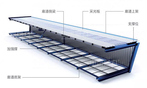 組裝式廊道采用模塊化設計,分體式加工,整體由廊道底架、廊道上架、廊道側梁、采光板、支撐位、加強撐等部位組成,不同部位運輸?shù)巾椖楷F(xiàn)場進行組裝,可以大幅度縮短項目建設周期,同時減少建設成本。