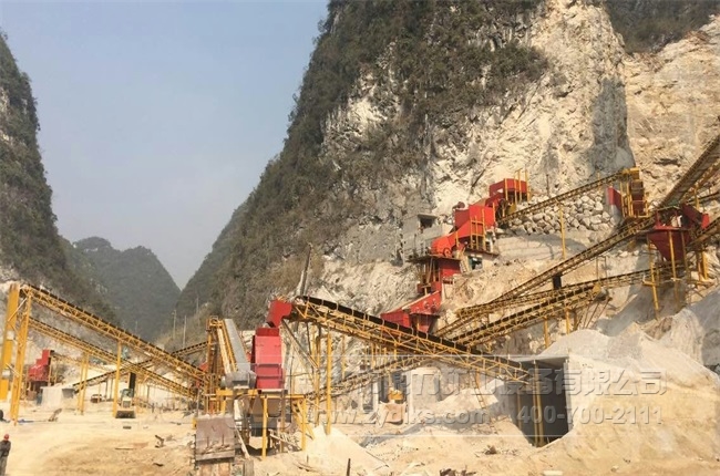 上圖為時產(chǎn)800噸碎石生產(chǎn)線的生產(chǎn)現(xiàn)場,依托山勢將山石進行破碎,不僅利用了當?shù)氐馁Y源,而且減少了物料輸送過程中的能源消耗,生產(chǎn)效率大大提高。