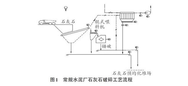 該水泥廠原有石灰石碎石生產(chǎn)線為重型板式喂料機+波動輥式喂料機+重錘式破碎機體系,聯(lián)合粉碎能力通常在900~1100噸/時,工藝流程見圖1: