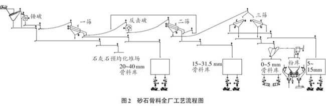 利用自有石灰石礦用配套投建砂石生產(chǎn)線采取的重錘式破碎機+整形錘式破碎機的主機設備見表1,廠工藝流程見圖2。