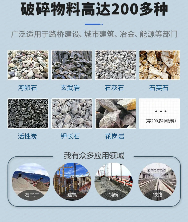 | 適應(yīng)物料: | 青石、石灰石、煤矸石等中低硬度脆性物料以及花崗巖、河卵石等高硬度物料 |