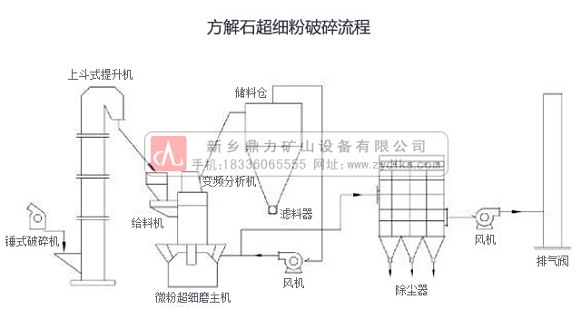 根據(jù)客戶對(duì)于方解石的產(chǎn)品質(zhì)量要求,配置對(duì)應(yīng)的生產(chǎn)線,如果是單單需要比較大顆粒的方解石成品料的話,只需要經(jīng)過我們公司破碎機(jī)設(shè)備的簡單破碎過程,就可以將成品料輸送出來,但是對(duì)于要求比較細(xì)的話,只配置上破碎機(jī)設(shè)備,不能達(dá)到終的要求,對(duì)于細(xì)度需要達(dá)到多少目的話,須配置上的磨粉機(jī)設(shè)備,一般來說生產(chǎn)的大致流程是這樣的,先經(jīng)過錘式破碎機(jī)的破碎流程,然后使用上斗式提升機(jī)將成品料提升到儲(chǔ)料倉內(nèi),然后經(jīng)過振動(dòng)給料機(jī)的輸送,輸送到細(xì)磨設(shè)備內(nèi),便完成了生產(chǎn)的過程,要的時(shí)候,需要配置上旋風(fēng)集粉器和脈沖除塵設(shè)備,大致的生產(chǎn)過程如下圖: